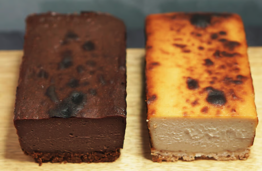 스테디셀러 플레인 치즈 케이크와 초콜릿 치즈 케이크 2종을 세트로 제공합니다.