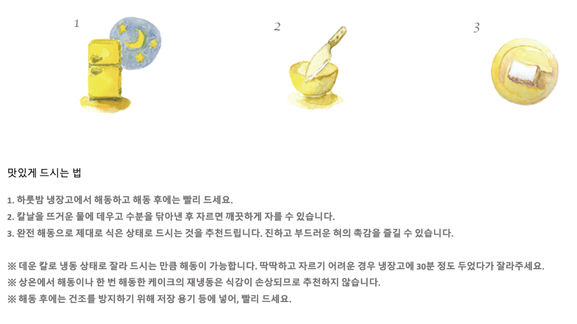 케이크는 냉동 상태로 보내드리므로 받으신 분이 원하는 타이밍에 드실 수 있는 것도 매력입니다.