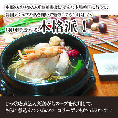 미국산 영계닭을 통째로 1마리 사용하여 콜라겐이 가득한 닭뼈 국물에 푹 삶았습니다.
